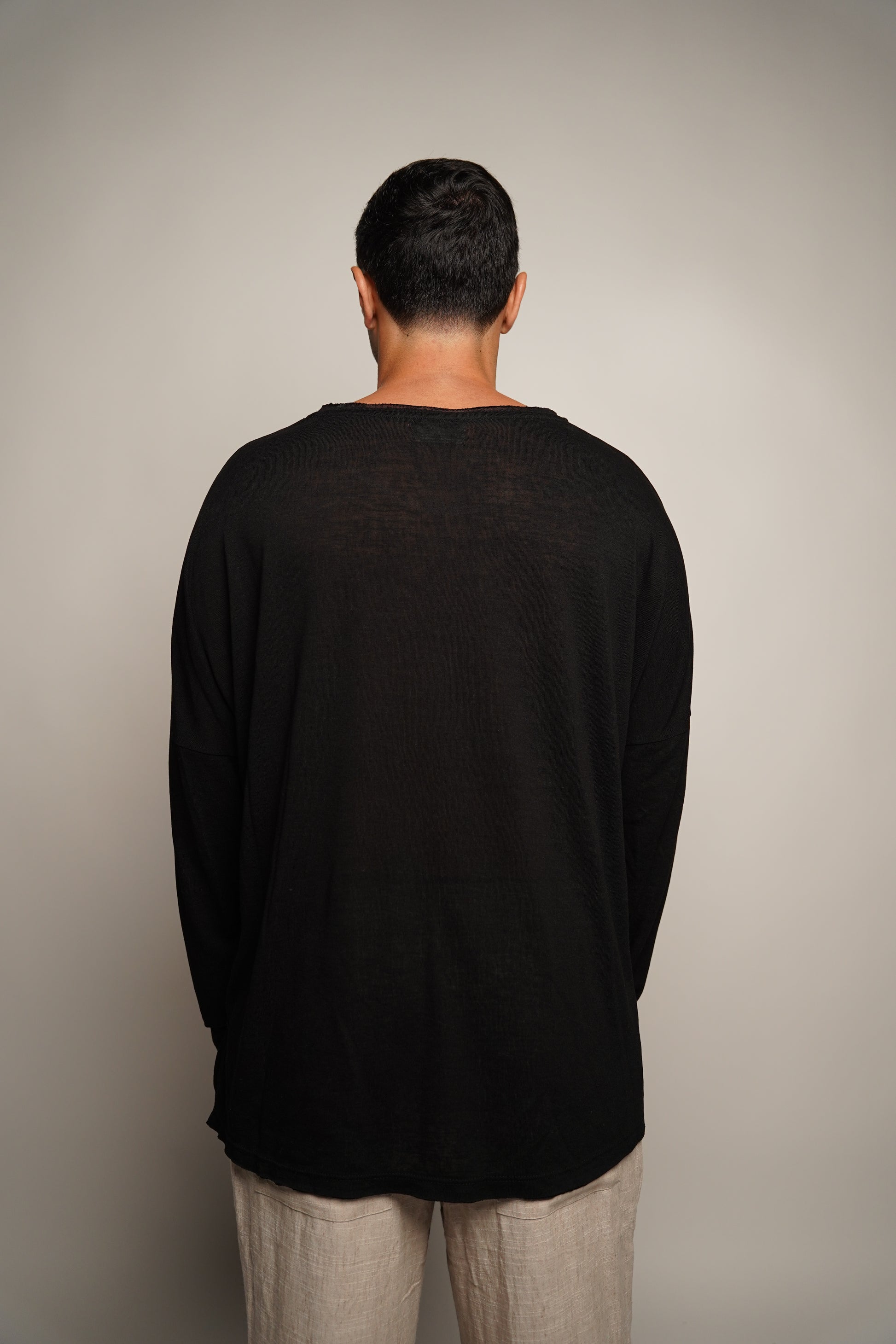 חולצת גברים שרוול ארוך מבד ריב , צווארון פתוח, טקסטורת פסים דקים , רכה במיוחד, גזרת אוברסייז במראה לא גמור